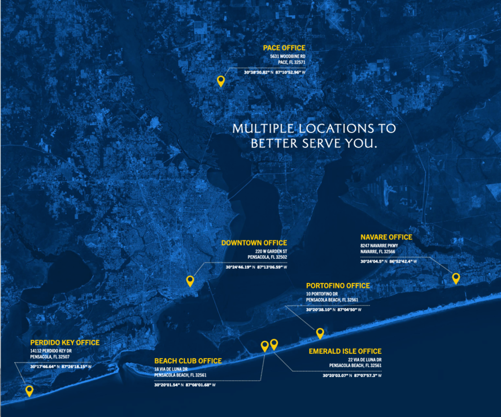 We’re thrilled to have beautiful offices strategically located in high traffic areas throughout the greater Pensacola area. These convenient touch centers are designed to accommodate busy schedules and create a welcoming, relaxed environment for meetings with agents and clients.